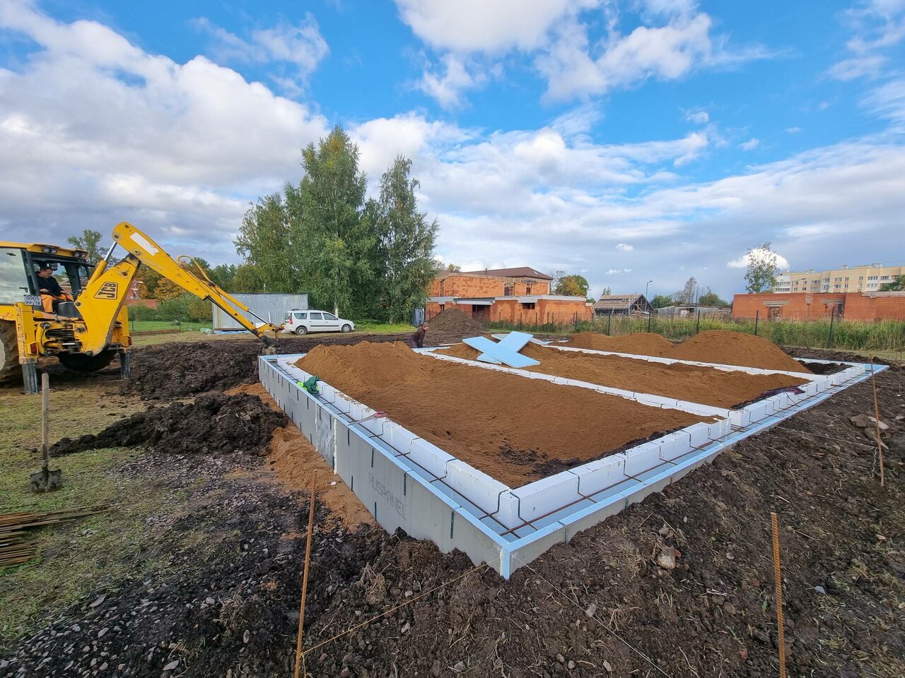 Фундамент выполнялся по собственной технологии, которая сочетает в себе ленточный фундамент и утеплённую шведскую плиту (УШП). Это решение было наиболее подходящим для моего участка с высоким уровнем грунтовых вод.